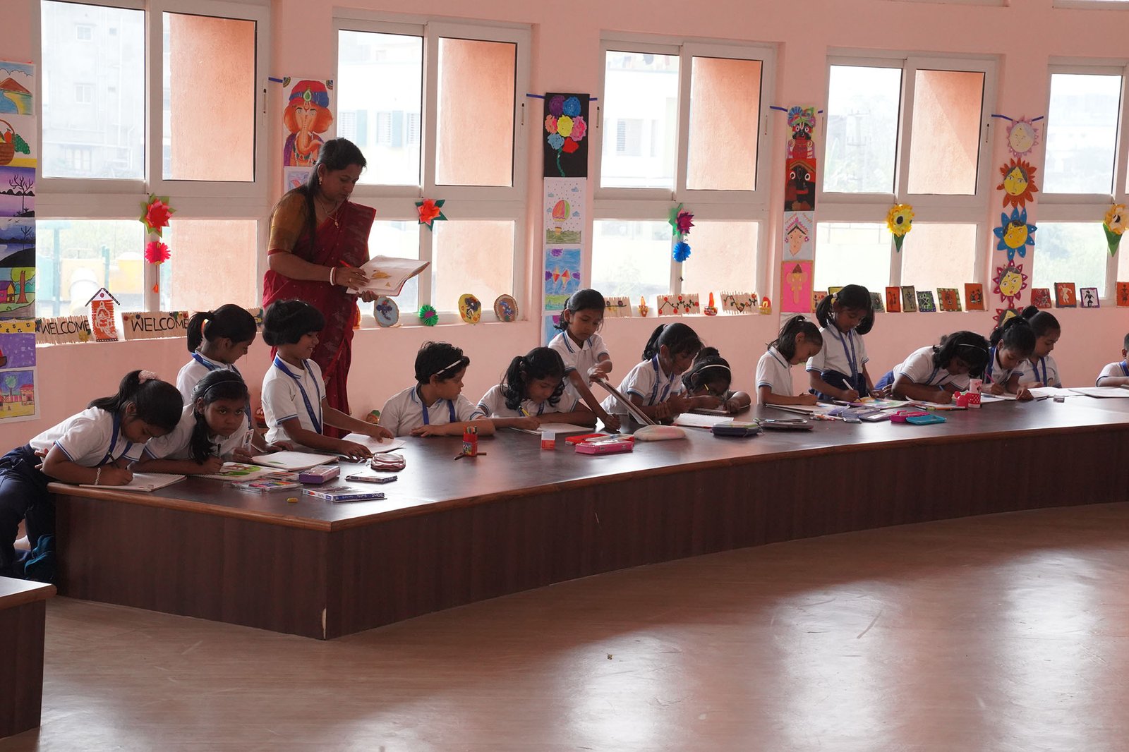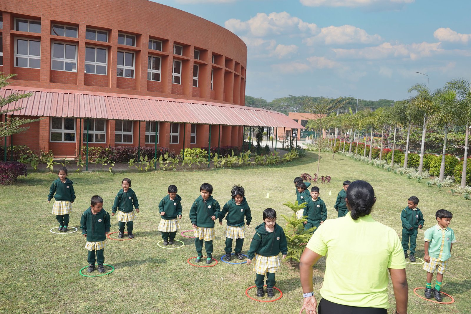 A two storeyed building with a unique round shaped architecture to allow light & air to flow freely inside the classrooms to give the children an ‘Open-Air Feel’.